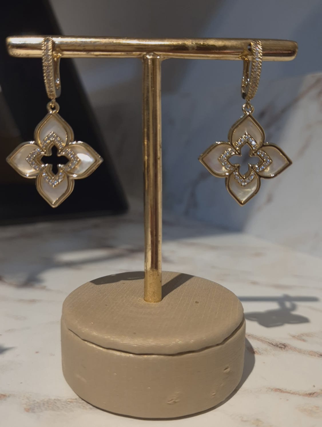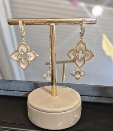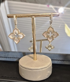 Argola elegante com detalhes em madre-pérola e cravação de zircônias, unindo brilho e delicadeza em uma peça sofisticada e versátil.