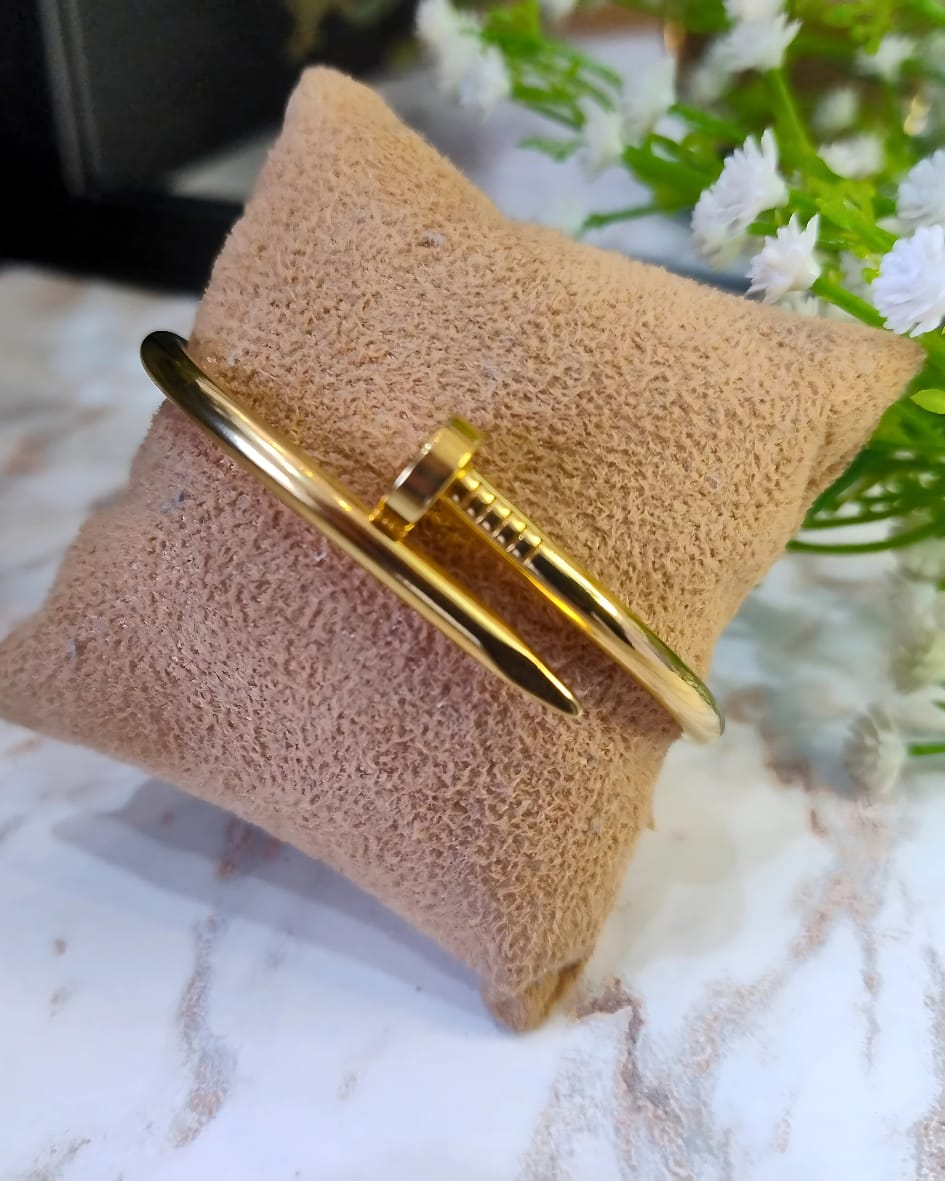O Bracelete Prego no aço dourado é uma peça sofisticada com design moderno e ousado. Inspirado em joias icônicas, ele traz personalidade e estilo em cada detalhe. Ideal para quem busca um acessório marcante, versátil e cheio de atitude. Perfeito para composições elegantes ou despojadas.