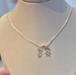Um colar que carrega amor, significado e muito carinho. Com banho de ouro, ele possui pingentes de menininho e menininha acompanhados de um delicado coração esmaltado, representando laços de amor, família e conexão.
