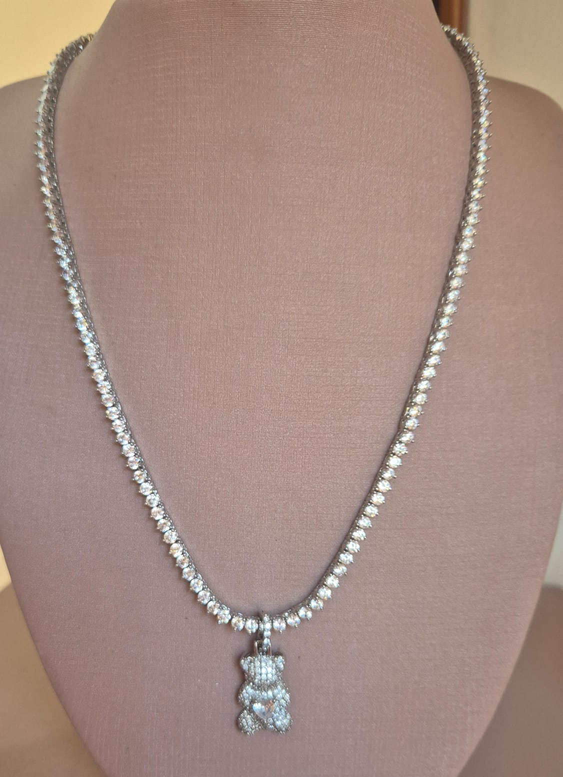 Colar Riviera em ródio branco, 35cm de comprimento, com brilho elegante e acabamento refinado. Acompanha pingente de ursinho cravejado, delicado e cheio de charme.