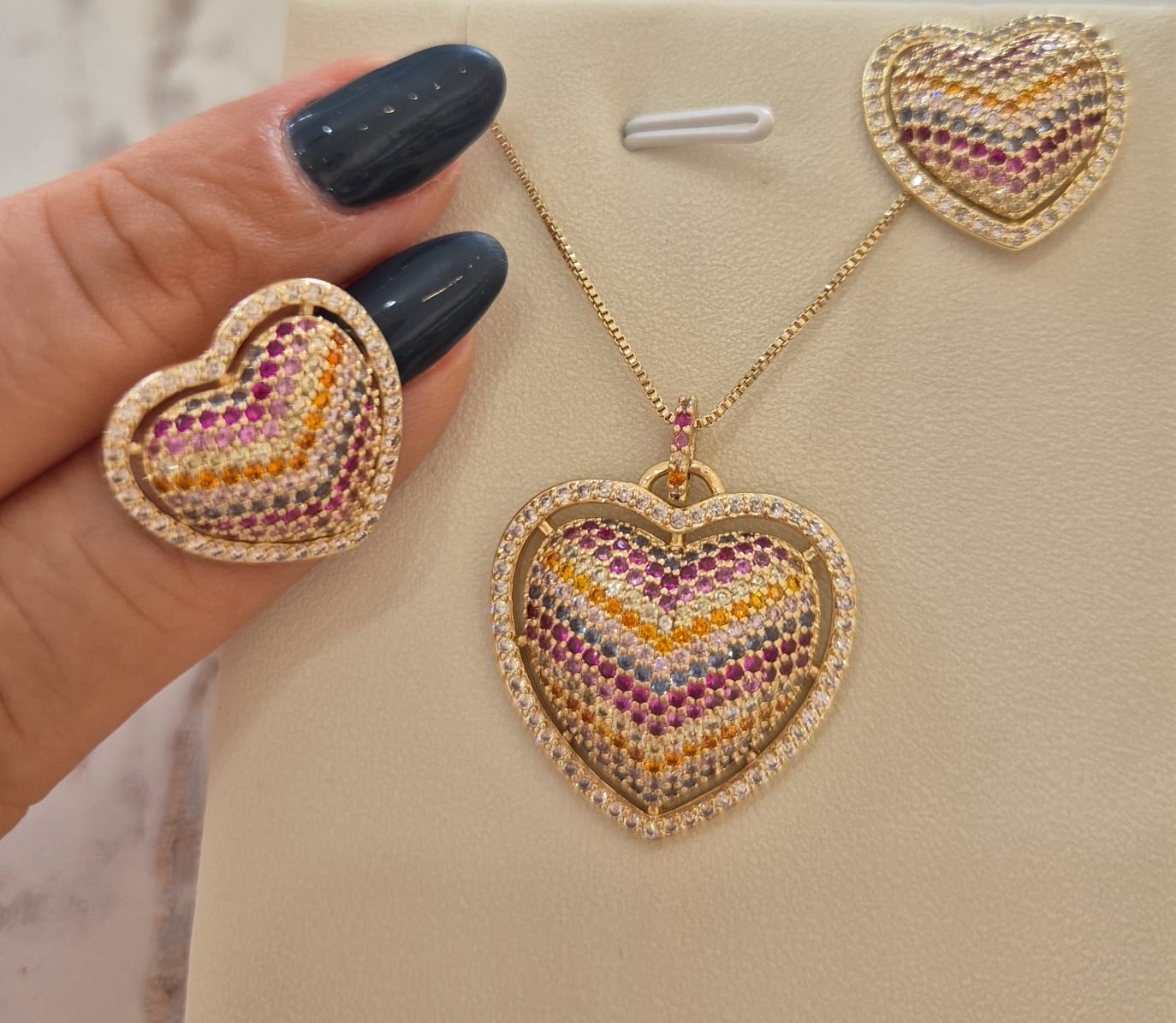 Delicado, romântico e cheio de charme! O conjunto de colar e brinco em formato de coração é todo cravejado com zircônias coloridas, que trazem um toque alegre, sofisticado e super elegante. Com banho de ouro, é aquele tipo de acessório que ilumina qualquer produção e adiciona um detalhe especial no seu look.